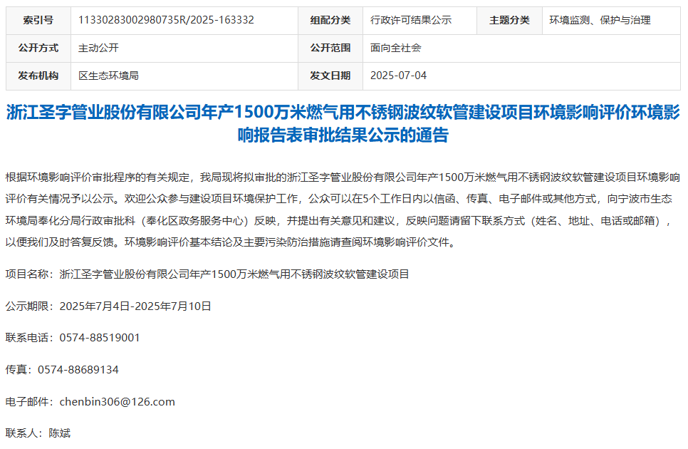 圣字管業(yè)年產(chǎn)1500萬米燃?xì)庥貌讳P鋼波紋軟管建設(shè)項目環(huán)評獲批公示
