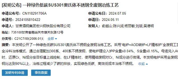 時間:07/06/2024 06:04:072024年7月5日,甘肅酒鋼集團宏興鋼鐵股份有限公司成功申請一項名為“一種綠色低碳SUS301奧氏體不銹鋼全廢鋼冶煉工藝”專利,申請公布號CN118291706A,申請日期為2024年5月11日。